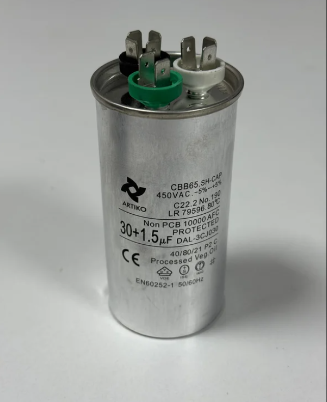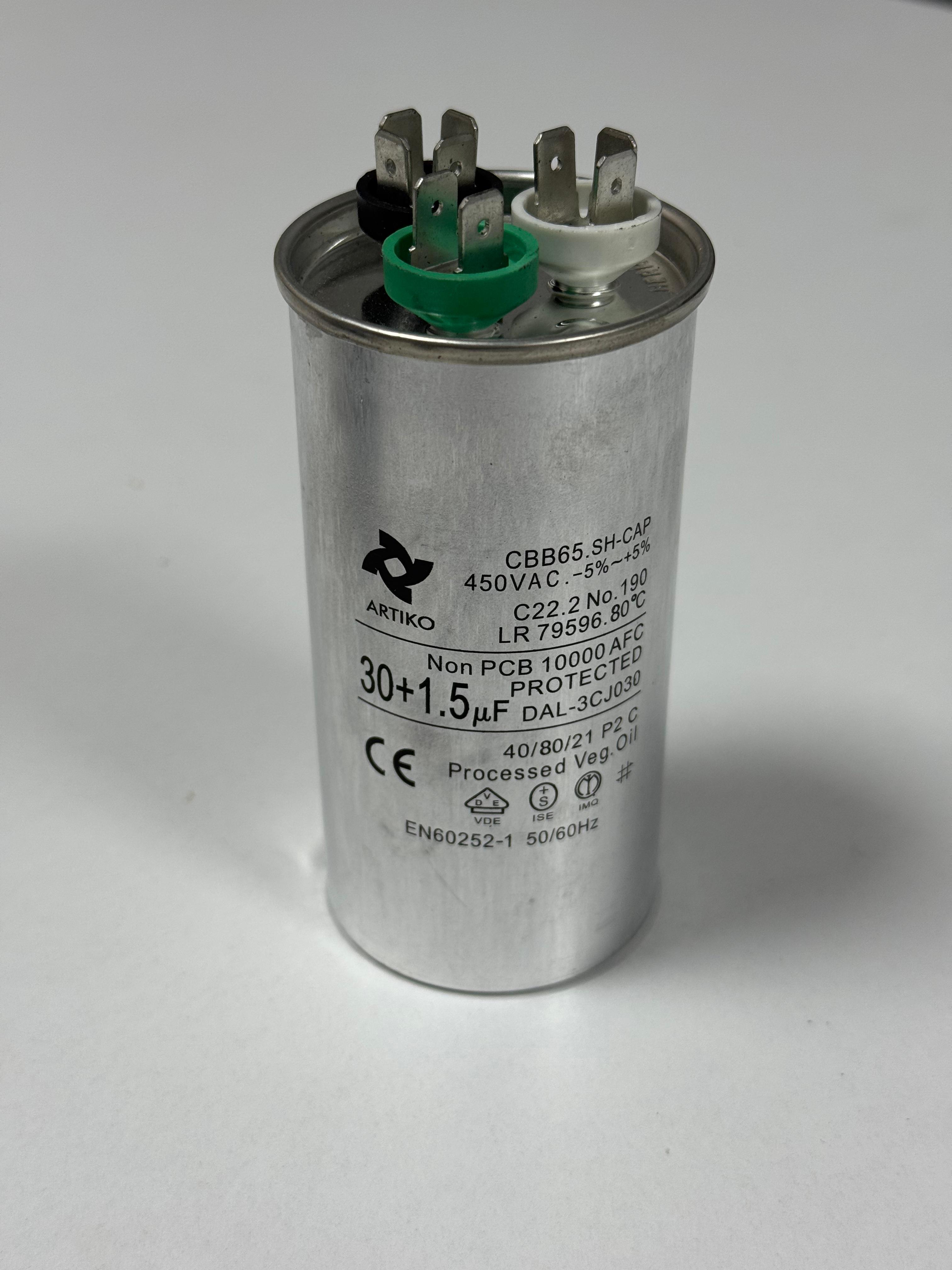 Kondansatör 30+1,5 µF, klima ve soğutma (HVAC-R) sistemlerinde iki farklı motoru tek gövdede desteklemek için kullanılan çift kapasiteli motor çalıştırma kondansatörüdür. 30 µF değeri genellikle kompresör motorunu, 1,5 µF değeri ise fan motorunu besleyerek sistemin dengeli ve verimli çalışmasını sağlar.