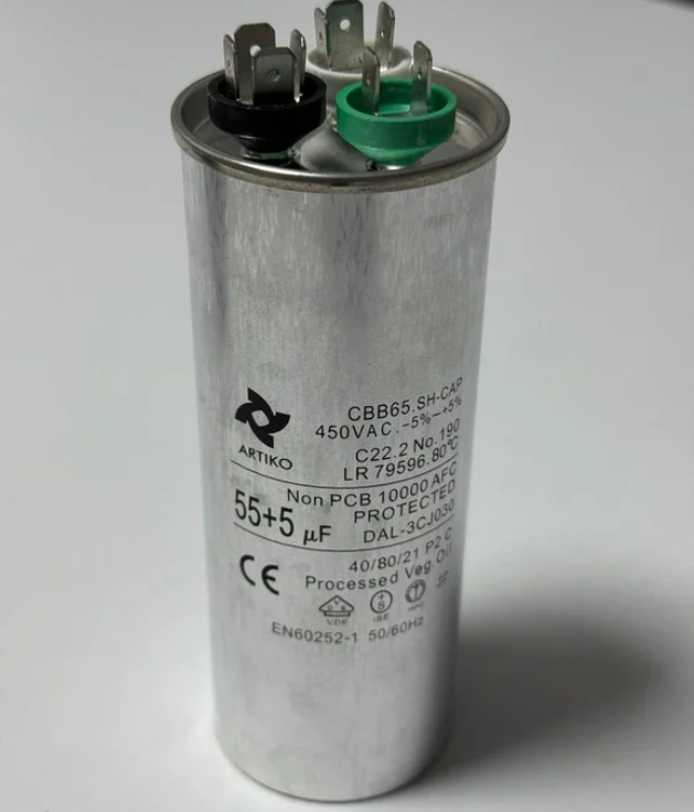 Kondansatör 55+5 UF, klima ve soğutma (HVAC-R) sistemlerinde iki farklı motoru tek gövdede desteklemek üzere tasarlanmış çift kapasiteli motor çalıştırma kondansatörüdür. 55 UF kapasite kompresör motorunu, 5 UF kapasite ise fan motorunu besleyerek yüksek kapasiteli sistemlerde stabil ve verimli çalışma sağlar.