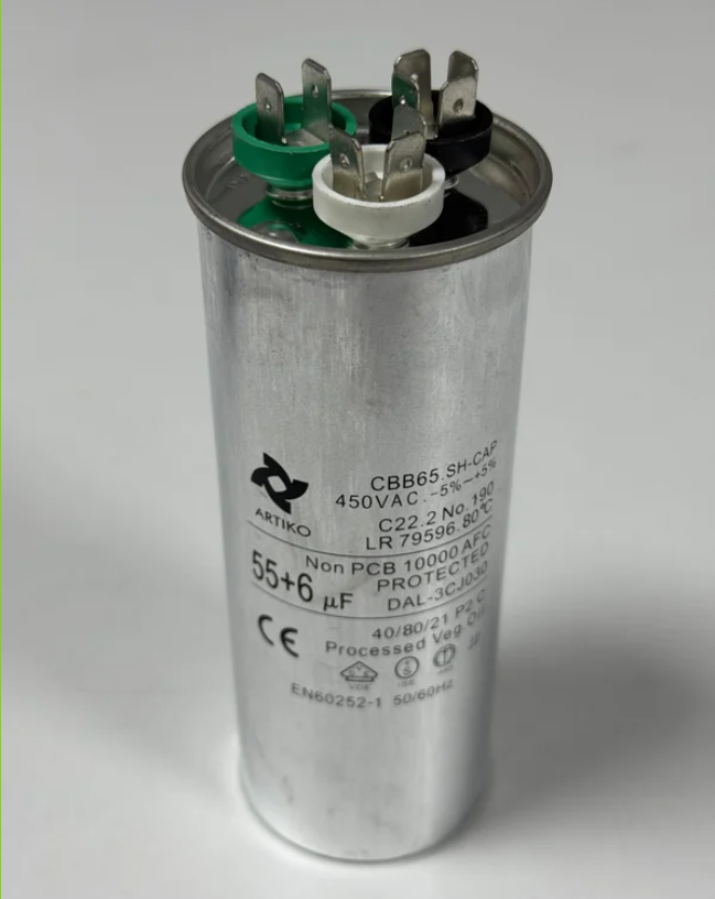Kondansatör 55+6 UF, klima ve soğutma (HVAC-R) sistemlerinde iki farklı motoru tek gövdede desteklemek üzere tasarlanmış çift kapasiteli motor çalıştırma kondansatörüdür. 55 UF kapasite kompresör motorunu, 6 UF kapasite ise yüksek güçlü fan motorunu besleyerek sistemin stabil, güçlü ve verimli çalışmasını sağlar.